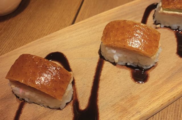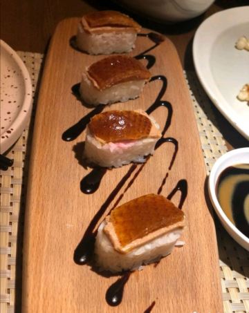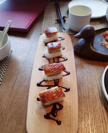 店面还算好找,距离直梯扶梯都不算远。装修蛮雅致,好些都是半封闭的隔间,私密性不错,周末十一点左右到店可选的位子还比较多,后面上人之后也就没断过了,菜品的话,鸭肝酱寿司一般没想的好吃,烤鸭不功不过没太大特色,甜面酱的纹路居然是晃出来的,还蛮有意思
