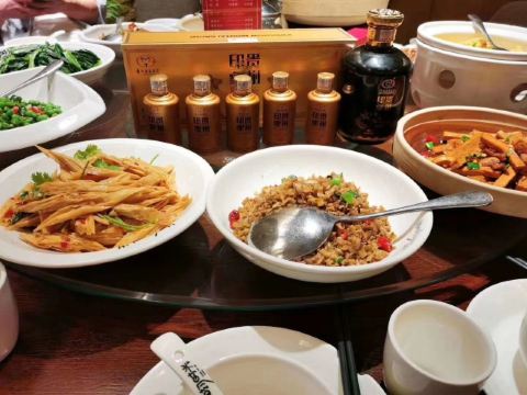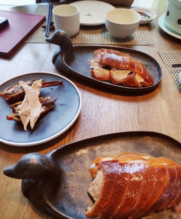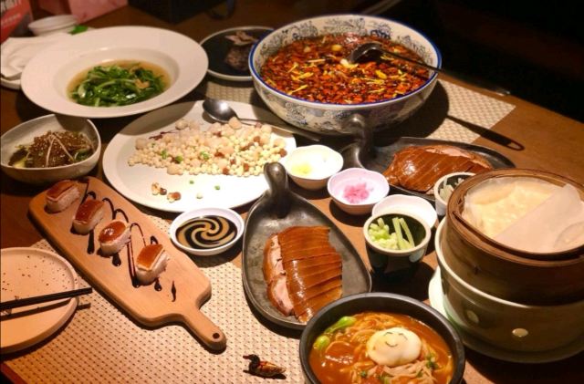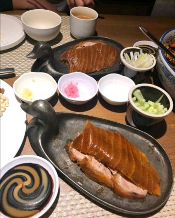 德永枣香烤鸭,鹅肝酱寿司,牛肝菌爆炒小白菜苗,夫妻肺片,自家制腊味煲仔饭,坚果酸辣虾球,不一样水煮鱼,京城层层肉饼,烤鸭小料,鸡油酒酿蒸大白鱼,六必居麻酱菠菜,糖饼,酥炸小黄鱼,家常烧茄子,竹林遇三鲜,海胆锅贴