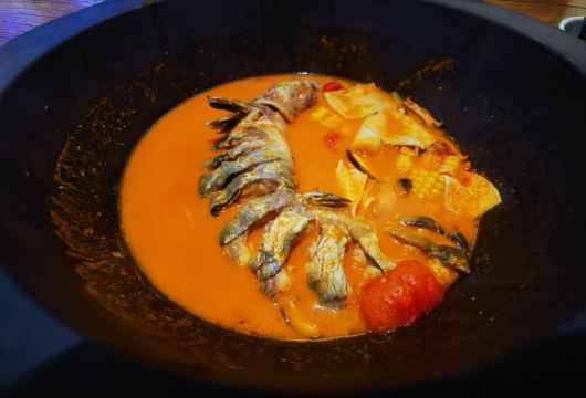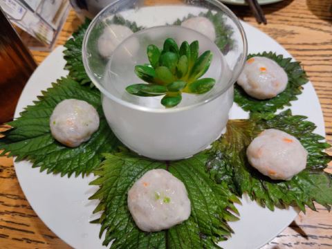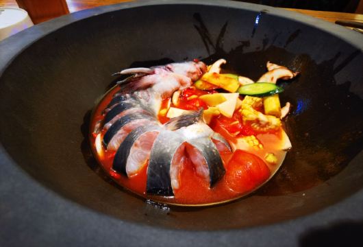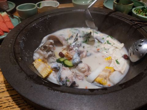 位于商场底商,环境有点嘈杂,排风一般,这个季节吃火锅有点热,不过服务绝对一流。每样菜都是服务员帮着涮的,鱼、菌类等食材涮多长时间也是定好时间,服务员帮着看的,吃的很省心。鱼据说现杀现下的,确实肉质鲜嫩,介绍说汤里不放鸡精、味精和添加剂,喝起来淡淡的鱼鲜味。配鱼吃的小料类似日本酱油,其他小料自取。先喝鱼汤再吃鱼,最后加汤涮其他肉菜,健康又美味。涮品推荐手打虾滑,加了胡萝卜和芹菜粒,味道不错。炸酥肉外酥里嫩。每人赠银耳汤一位。