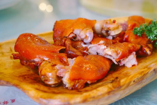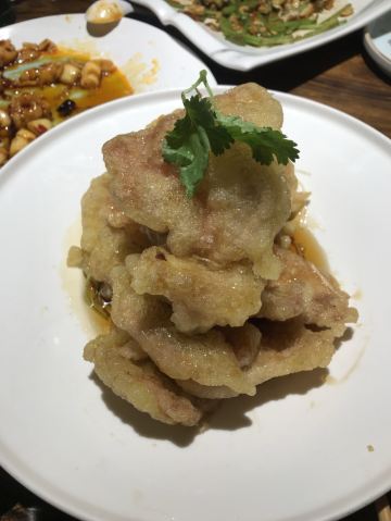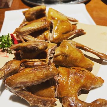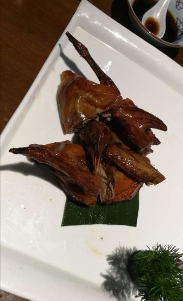 枫行Maple1️⃣[黄泥烧鸽子],主打的烧鸽子是一定要尝尝的。这家鸽子有三种做法,黄泥烧鸽子是裹在黄泥里入火烧成。还有盐焗做法和脆皮乳鸽。黄泥做法的鸽子,颜色如同酱腌制过,比较其他两种,视觉上小一圈。口感上,皮和肉的水分烤的比较干,油脂含量也非常低,肉质扎实且筋道,需要慢慢嚼,有那种鸽子肉的香气。不过吃了另外2两种后,大家觉得更佳。 2️⃣[盐焗乳鸽],表皮发黄的鸽子,表皮上油亮亮,一只只肥嘟嘟的,让人欢喜。皮里有一层薄薄的很香的油脂,让鸽子肉更显丰腴。个人更喜欢这个做法。 3️⃣[脆皮乳鸽],虽然是家东北菜馆,做的脆皮乳鸽胜过诸多北京港式餐厅。肉厚,味道香,皮很有味道,非常可。 4️⃣[老汤酱猪手],在一楼档口看到的猪蹄,点一份尝尝。可能因为放到了常温,软糯不够,Q弹有余。