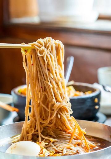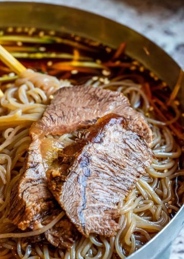 【朝鲜冷面】不管是吃不吃烤肉都得来一份。里面都是常见的基本菜码:苹果片、鸡蛋、牛肉、些许泡菜等。肉片很大块,汤底也是酸甜,能想象到夏天吃有多痛快了!