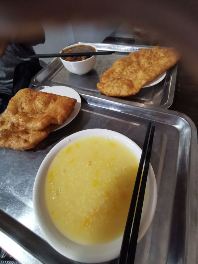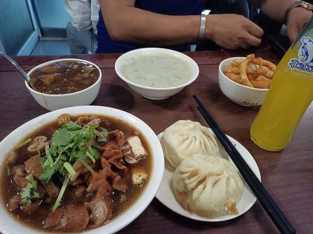 躺平生活家从后海出来 就顺着小路直奔老字号而来,导航还是比较好找,又是在路边上,门头也醒目,有故事。 点完菜之后,自己动手去端。 人不多,但是都想来一份尝尝,就连一直没有敢点的豆汁也来了一份。炒肝跟我们我们这边芡粉勾汤感觉一样,就是用的内脏比较多,汤汁粘稠挂喉,吃的时候不用筷子不用勺,而是用手托着碗底,举到嘴边吸溜儿着喝。菜品都是还是不错实在,就是豆汁驾驭不了,没敢来两口,配的焦圈都还好。炸酱面比较清淡爽口,面条经道爽滑,配上黄瓜整体温和入口, 老北京的馆子环境都感觉差不多,都比较务实不花哨。看着周围大爷,大妈慢慢喝着炒肝,我们也身临其境细细体会,如同澳门老街的大爷大妈点杯奶茶下个菠萝包一般,每个地方都当地的特色。