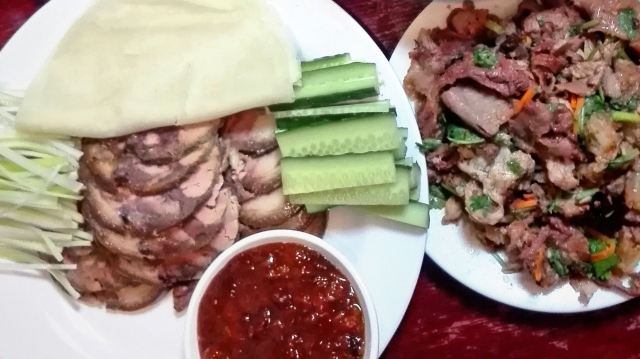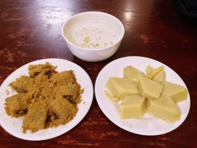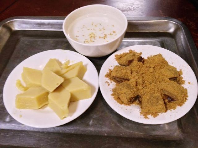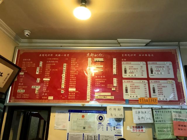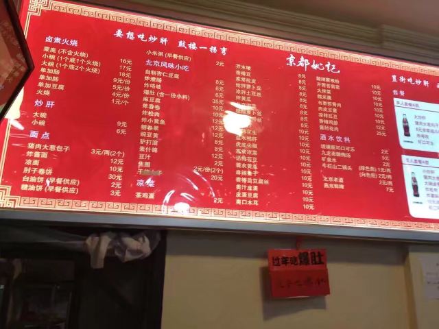 麻豆腐,老北京炸酱面,猪肉大葱包子,炒肝,爆肚,卤煮火烧,焦圈,自制杏仁豆腐,炸灌肠,豆汁,炸咯吱,西葫芦鸡蛋馅素包子,香葱炸酱面,豌豆黄,芥末墩,蓑衣黄瓜,冰豆浆,肉饼,黑加仑,炒肝包子,小米粥,炸酱面