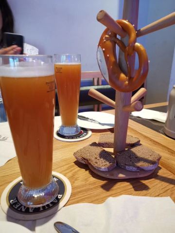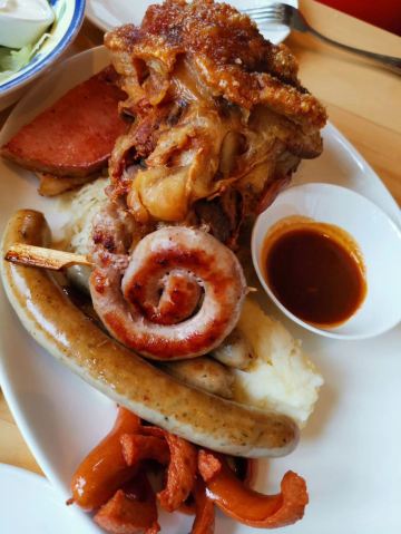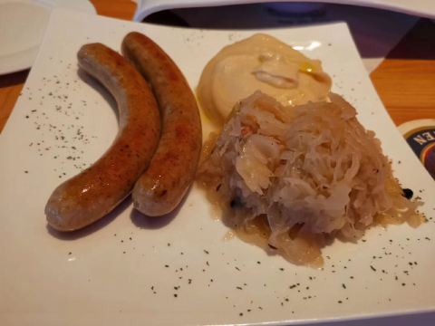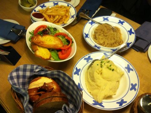 啤酒屋特色肉盘,海鲜蔬菜沙拉,海陆拼盘,日出东方轻食沙拉,香肠及烤肘子拼盘,碱水包,自酿小麦啤,烤猪膝,金枪鱼沙拉,海鲜意面,普拉纳啤酒,餐前面包,拼盘,鹅肝双重奏,猪肝酱,面包,白肠,小麦啤酒,苹果卷,Paulaner,肘子,自酿啤酒,黑啤,沙拉,猪肘,匈牙利牛肉汤,煮猪膝,啤酒,香肠,牛肉汤,酸菜,烤肠,薯条