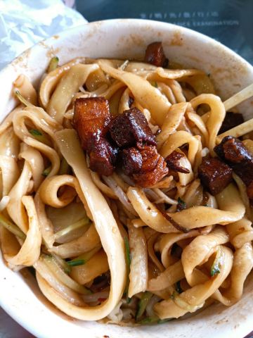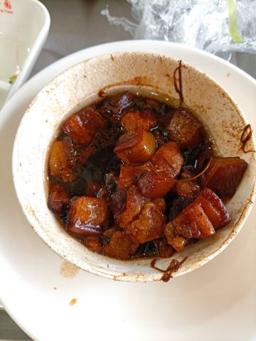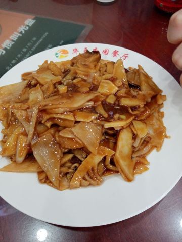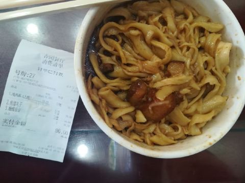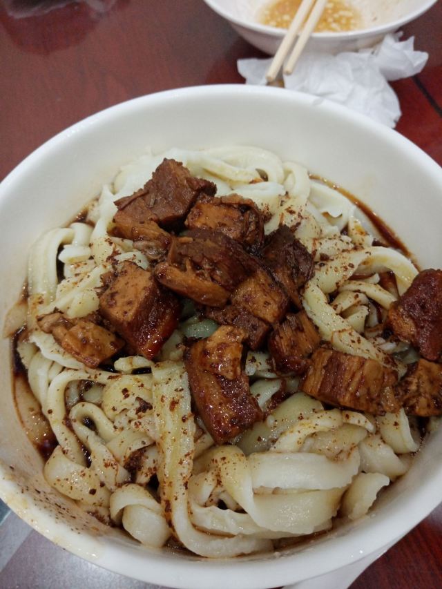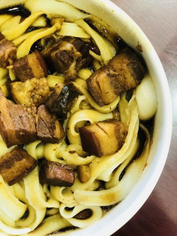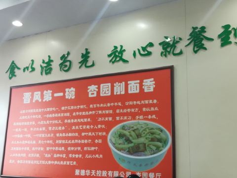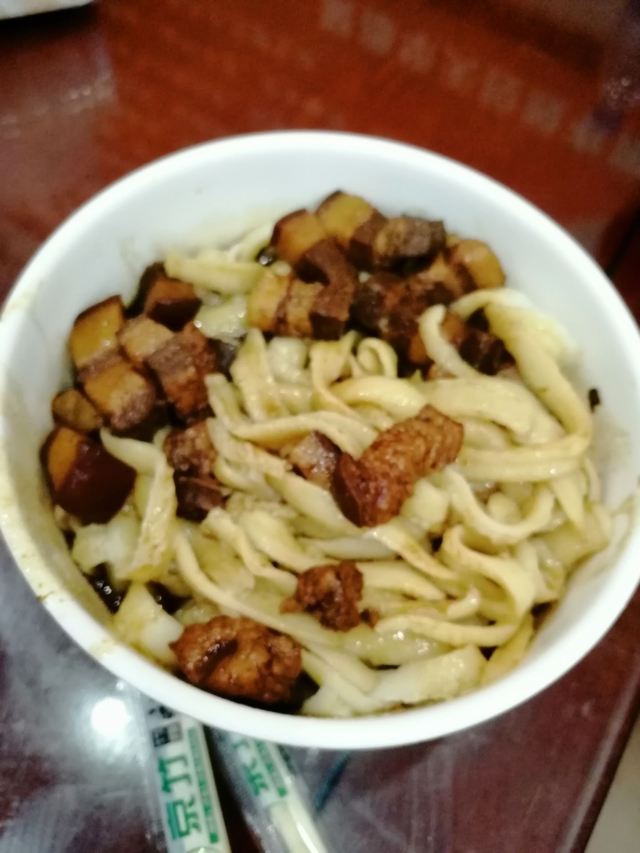 杏园餐厅的招牌菜是炖肉刀削面,白煞煞的面条上面点缀了几小块炖肥肉,吃起来面有韧劲却不难嚼,肥肉只香不腻。