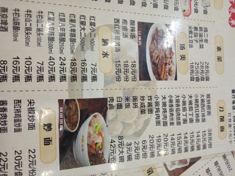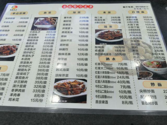 干炸丸子,糖醋里脊,牛肉,过油肉,小炖肉面,软炸虾仁,浇汁豆腐,焦熘丸子,三鲜锅巴,炸酱面,宫保鸡丁,双拼捞面,烧二冬,大炖肉面,大茄丁面,麻豆腐,鱼香肉丝,香葱炸酱面,包子,虾仁鸡丝面,三鲜炒面,糖醋丸子,焦溜丸子,糖油饼,软炸里脊,酸辣瓜条,茄子面,酱爆鸡丁,糖耳朵,炖肉面,刀削面