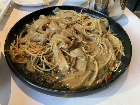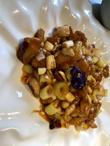 环境走的是那种简单简约风,还算干干净净吧。 服务还挺热情的吧。有一个服务员长得很漂亮,印象比较深刻。嘿嘿 「披萨宫保鸡丁」从小到大都喜欢吃宫爆鸡丁,他家的鸡丁稍微有点辣,味道有点偏重了。 其他都还好,等疫情过去还会过去吃
