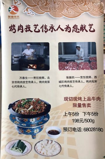 麻豆腐,驴打滚,烤牛肉,烤精品羊肉,芫爆散丹,宫爆虾球,糖熘卷果,红烧牛尾,糖卷果,它似蜜,烧饼夹肉,豌豆黄,乌鱼蛋汤,芝麻鸭肉,宫保虾肉,烤肉,芥末鸭掌,焦溜肉片,醋溜木须,焦炒牛肉,干烧黄鱼,小豆凉糕,酸辣瓜条,烤羊腿,烧饼,羊肉串,干烧桂鱼,炙子烤肉,老北京烤肉,包子,经典风爪,糖火烧,素菜团子,腕豆黄,墩饽饽~太干。。,糯米糕,扒鸡,牛肉包子,牛肉包,牛腱子,菜团子,炸松肉,窝头,酸辣乌鱼蛋汤,精品红烧牛尾,烤精品牛肉