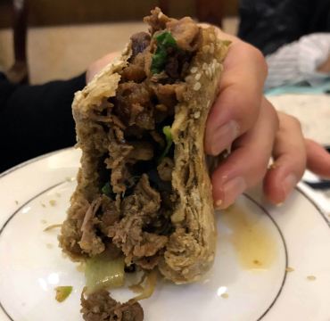 KaoRou Wan Restaurant(Nan LiShi Road)烤肉宛最著名的当然是烤肉,烤肉技艺纳入国家非文化物质遗产目录。我们享用了店里烧饼夹烤肉。很有仪式感的享用过程是,服务员端着铜盆盛着冒着香气扑鼻的烤肉介绍,然后将新出炉的芝麻烧饼的芯取出一部分,夹上烤肉,送到吃客的小盘里,配有黄瓜条和大蒜。大家迫不及待开吃,谈话都停下来了。烤肉鲜嫩有汁水,烧饼满口香气。吃了一半,大家开始交流口味。这烤肉是上等的,有烤肉技艺传承人制作。专选最嫩的部位,讲究刀工和拌料,果木烤制,肉质润滑,又有嚼头。吃罢这一道已经很饱,怪不得服务员事先告知,为了让大家多品尝其他菜肴,把烧饼的芯挖出了一部分。 烤肉宛精品烤肉限量供应。芫爆散丹也是清真菜中必点,量大,火候掌握得好。 糖咸卷果咸口和甜口的合一,细腻,有造型,味道合适。 这家烤肉宛的位置在北京儿童医院附近,那一带是全天拥堵地段,前往烤肉宛最好的交通是地铁1号线到南礼士路东北口出站,步行几分钟就到了。