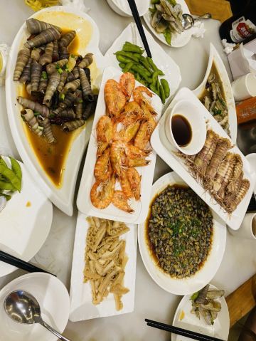 白灼基围虾,温州米粉,蛏子,葱油泥螺,温州拌面,椒盐九肚鱼(小龙鱼),鱼丸汤,椒盐皮皮虾,辣炒花蛤,红烧小黄鱼,辣炒海螺,咸鱼茄子煲,莴笋干五花肉,红烧芋头,醉虾,辣炒蛏子,蒜蓉粉丝蒸扇贝,白灼皮皮虾,小龙鱼烧豆腐,炒米粉