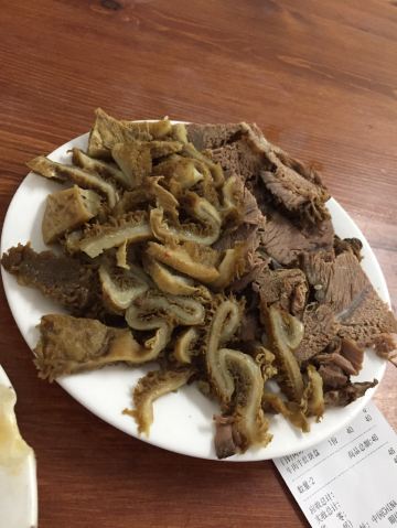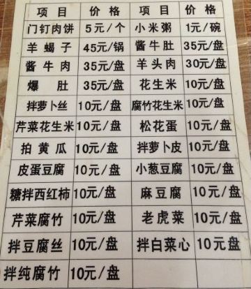 门钉肉饼,麻豆腐,拍黄瓜,芹菜花生米,酱牛肉,皮蛋豆腐,爆肚,羊羯子,小米粥,芹菜腐竹,烤包子,麻酱,羊头肉,拌白菜