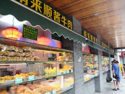 古朴的店招,一长溜的点心和卤味,酱牛肉电烤鸡……琳琅满目,早上有传统北京早餐供应,油饼花卷豆腐脑味道不输几家网红早点点哎