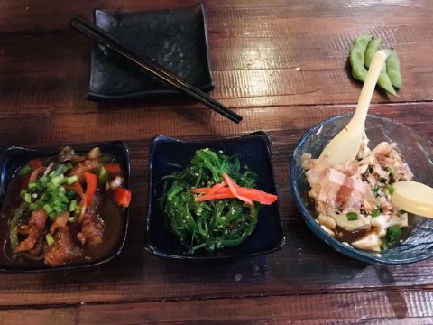 山贼烤牛舌,芥末章鱼,海盐烤秋刀鱼,大yellow,梅子茶泡饭,寿喜烧牛肉火锅,烤五花肉,清酒,烤鳗鱼,骨汤拉面,芥末小章鱼,烤牛舌,烤鸡皮,墨鱼丸子,清酒蛤蜊