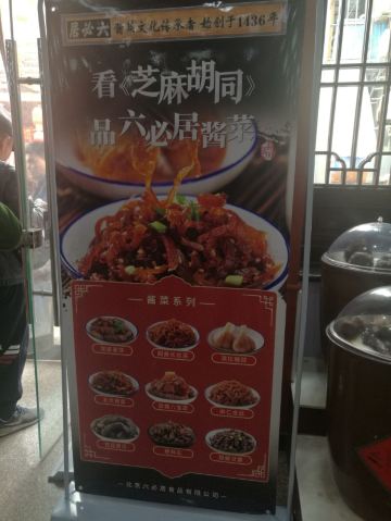 chinadesk1电视剧《芝麻胡同》播出后,据说六必居顾客更多了。在当今倡导低盐健康生活年代,专门卖腌制产品的前门六必居酱园里人头攒动。六必居店里弥漫着浓郁的酱香味儿,靠墙一溜盛着各种酱菜的大坛子。北京当地居民有的从老远过来,买几样咸菜,为的是记忆中的味道。游客买包装好的礼盒,一定也是听说过六必居的故事或是在外地的北京人也惦记着这一口。六必居酱园传说是山西临汾人开办的卖杂货的小店铺,至今已有近五百年历史。有说六必居源于开门七件事:柴、米、油、盐、酱、醋、茶,这家小铺不卖茶,称为六必居。也有解释六必居制作酱菜遵循六条规则,黍稻必齐,曲蘖必实,湛之必洁,陶瓷必良,火候必得,水泉必香。前门六必居从大栅栏进去左拐就到了,很容易找到。