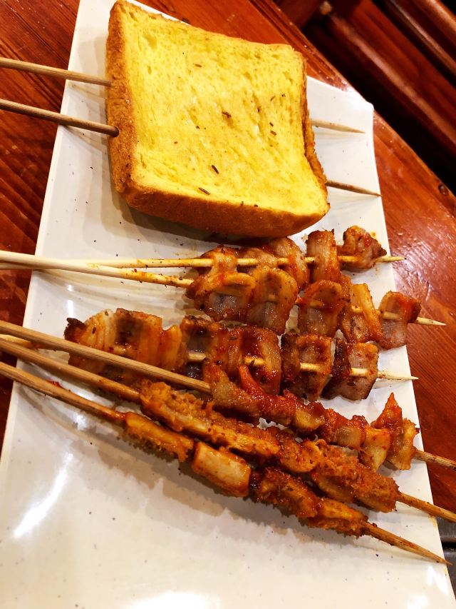 羊蝎子,蜜汁烤翅,羊肉串,烤面包片,炒面,烤金针菇,烤鱼豆腐,芝士烤虾,黑椒烤牛肉,烤麵包片,疙瘩汤,烤扇贝