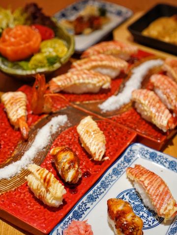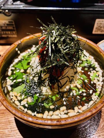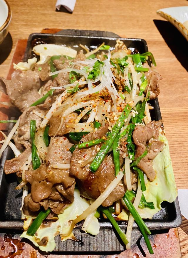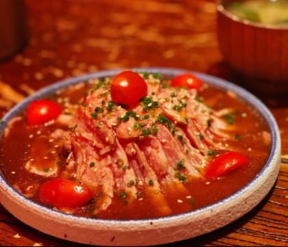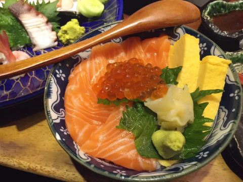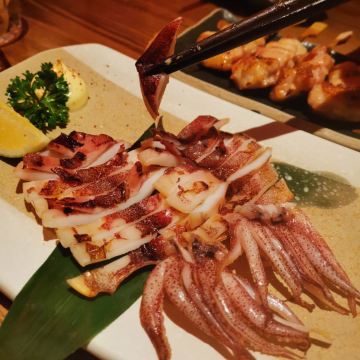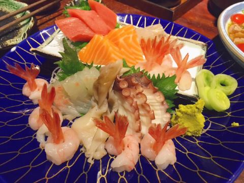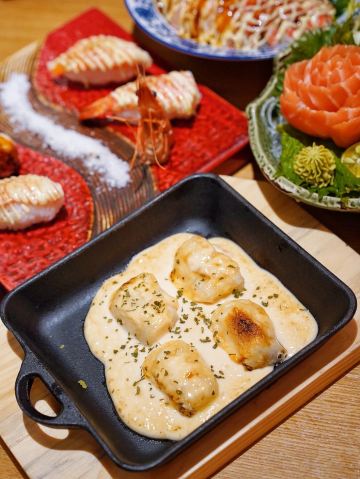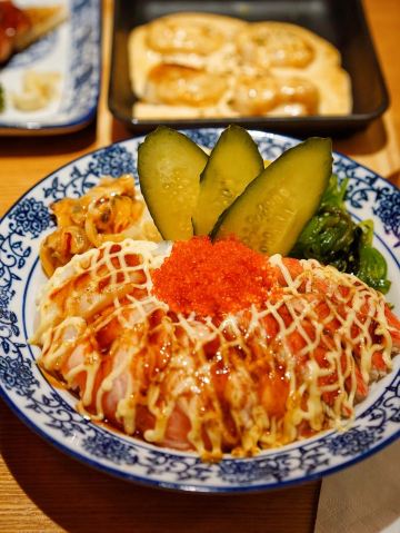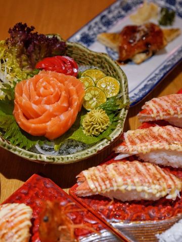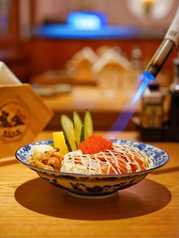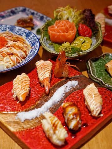三文鱼沙拉,黑松露明太子烤土豆,鳗鱼饭,日式麻婆豆腐,豆腐沙拉,半熟牛肉,三文鱼刺身,烤串拼盘,茶泡饭,芥末章鱼,酱汁鸡肉棒,甜虾刺身,炸鸡块