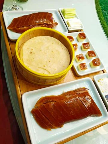 爱尚食色馥天下烤鸭走进联合国,传播中华美食! 馥天下烤鸭店,在帝都丰台区,很有北京特色的菜品,周末有排队。人均120元左右,吃到撑!特色菜:北京烤鸭、鱼头泡饭!进门看好走进联合国的合影,满满的自豪,民族自信,美食无国界。“馥”出自宋代大词人苏轼<<千秋岁>>是香味香气的意思,馥天下诠释着美食香味遍天下,健康美食进万家,扬名中华!餐厅的经营菜品,也是以北京特色菜为主! <落座后的体验>北京风格装修,已经在这里开了好多年了,大红的门,浓浓的中国风,很北京的味道!应该是去年又新装修好的,进门左边☜是明档烤鸭,看的见的干净,闻得到的香味!落座后,服务员笑脸相迎,因为是提前预定,服务员咨询有什么特别喜欢吃菜品,因为请来北京的朋友,所以点了一些,很有北京特色的菜品!没有任何硬性推销,彰显服务真谛! 北京烤鸭169元一套:好友来帝都,必须吃烤鸭,吃法讲究:第一种吃法,鸭皮沾白砂糖,入口即化,酥香满口,可以吃出香甜。第二种吃法,鸭饼卷三片带皮鸭肉沾少许面酱,再加俩片薄荷叶卷着吃,清新爽口,薄荷味浓。第三种吃法,是传统吃法,鸭饼卷鸭肉夹上少许葱丝,瓜条沾甜面酱,可以吃出酱香味浓。最后鸭架子还可以做汤,原汤化原食,很讲究的吃法! [双手合十] <鱼头泡饭>49元/斤:是用一个大锅上来的,很霸气的装盘。口味酱香浓郁,鲜香软糯,再配上一口上等米饭,满满的幸福感!经过烹调,他们家的鱼头没有任何土腥味, [双手合十] 自制老豆腐39元/例:口味咸鲜豆香,口感香甜软烂。配了些虾干,蘑菇,经过烹调后豆腐炖至蜂窝。汤色金黄,能出吃出豆香味突出,很接地气的味道! [双手合十] 芥辣虾球89元/例:口味芥末奶香,口感外酥里嫩。一共10只左右,装盘很有国际范,人多需要注意,小朋友不能吃的! [双手合十] 榄菜四角豆拌桃仁39/例:口味橄榄菜酱香,口感脆爽,白绿呼应,彰显很美,能吃出核桃的脆爽。核桃仁很补脑适合我,哈哈 [双手合十]捞汁珊瑚蛰49/例:上桌后稍加拌制,口味咸鲜酸甜微辣,口感脆爽,适合这样的夏天,体验海鲜的味道! 砂锅霸王肚88/例:很香的麻酱,入口是Q弹,这应该是芫爆肚丝和麻酱火锅的结合吧,吃货的想象力,值得佩服吧! 拔草小贴士 服务宾至如归,上菜速度快,烤鸭最好提前预定! 营业时间: 上午:11:00-14:00 下午:17:00-21:00 环境:北京特色装修