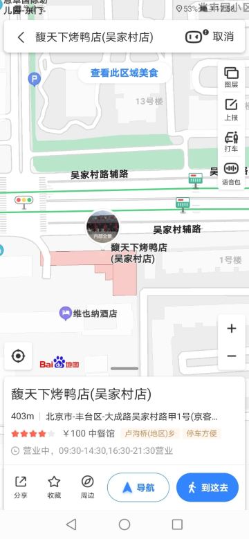 Futianxiakao Duck (wujiacun)馥天下烤鸭走进联合国,传播中华美食! 馥天下烤鸭店,在帝都丰台区,很有北京特色的菜品,周末有排队。人均120元左右,吃到撑!特色菜:北京烤鸭、鱼头泡饭!进门看好走进联合国的合影,满满的自豪,民族自信,美食无国界。“馥”出自宋代大词人苏轼<<千秋岁>>是香味香气的意思,馥天下诠释着美食香味遍天下,健康美食进万家,扬名中华!餐厅的经营菜品,也是以北京特色菜为主! <落座后的体验>北京风格装修,已经在这里开了好多年了,大红的门,浓浓的中国风,很北京的味道!应该是去年又新装修好的,进门左边☜是明档烤鸭,看的见的干净,闻得到的香味!落座后,服务员笑脸相迎,因为是提前预定,服务员咨询有什么特别喜欢吃菜品,因为请来北京的朋友,所以点了一些,很有北京特色的菜品!没有任何硬性推销,彰显服务真谛! 北京烤鸭169元一套:好友来帝都,必须吃烤鸭,吃法讲究:第一种吃法,鸭皮沾白砂糖,入口即化,酥香满口,可以吃出香甜。第二种吃法,鸭饼卷三片带皮鸭肉沾少许面酱,再加俩片薄荷叶卷着吃,清新爽口,薄荷味浓。第三种吃法,是传统吃法,鸭饼卷鸭肉夹上少许葱丝,瓜条沾甜面酱,可以吃出酱香味浓。最后鸭架子还可以做汤,原汤化原食,很讲究的吃法! [双手合十] <鱼头泡饭>49元/斤:是用一个大锅上来的,很霸气的装盘。口味酱香浓郁,鲜香软糯,再配上一口上等米饭,满满的幸福感!经过烹调,他们家的鱼头没有任何土腥味, [双手合十] 自制老豆腐39元/例:口味咸鲜豆香,口感香甜软烂。配了些虾干,蘑菇,经过烹调后豆腐炖至蜂窝。汤色金黄,能出吃出豆香味突出,很接地气的味道! [双手合十] 芥辣虾球89元/例:口味芥末奶香,口感外酥里嫩。一共10只左右,装盘很有国际范,人多需要注意,小朋友不能吃的! [双手合十] 榄菜四角豆拌桃仁39/例:口味橄榄菜酱香,口感脆爽,白绿呼应,彰显很美,能吃出核桃的脆爽。核桃仁很补脑适合我,哈哈 [双手合十]捞汁珊瑚蛰49/例:上桌后稍加拌制,口味咸鲜酸甜微辣,口感脆爽,适合这样的夏天,体验海鲜的味道! 砂锅霸王肚88/例:很香的麻酱,入口是Q弹,这应该是芫爆肚丝和麻酱火锅的结合吧,吃货的想象力,值得佩服吧! 拔草小贴士 服务宾至如归,上菜速度快,烤鸭最好提前预定! 营业时间: 上午:11:00-14:00 下午:17:00-21:00 环境:北京特色装修