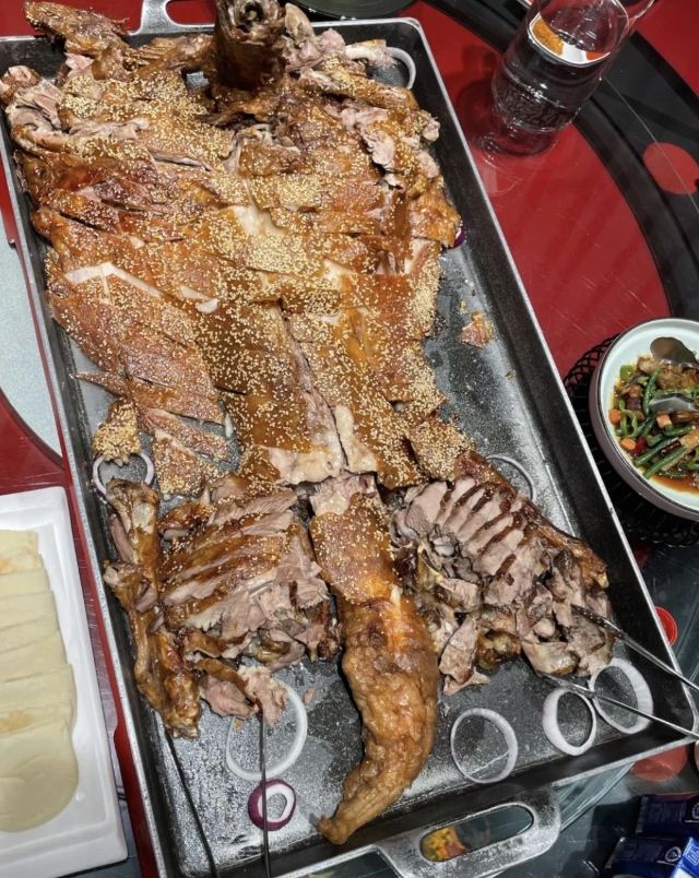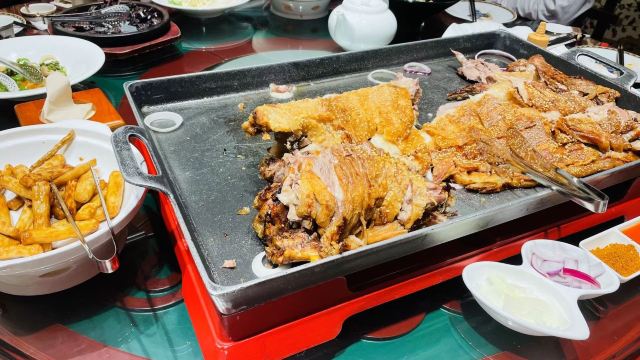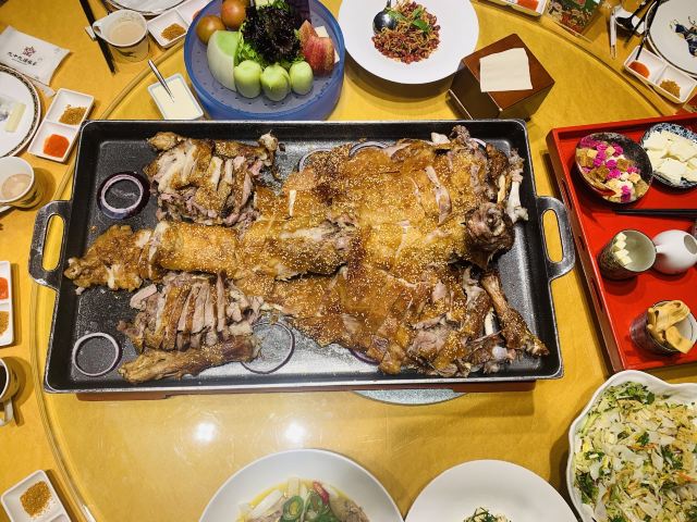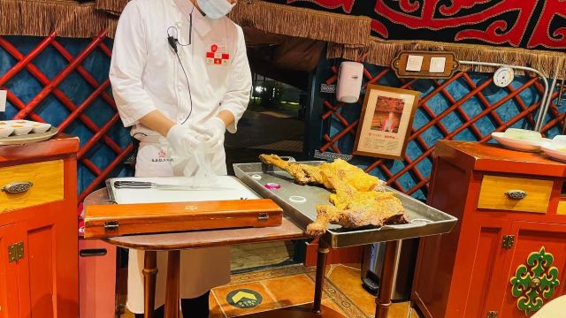 位于永泰庄绿色庄园内的烤全羊,每个蒙古包里的陈设、餐具都十分讲究,用餐期间还可在包间享受蒙古特色歌舞,热闹非凡。毡房烤全羊是这里的招牌,外焦里嫩,肥美而不油腻,更重要的是没有丝毫腥膻之味。
