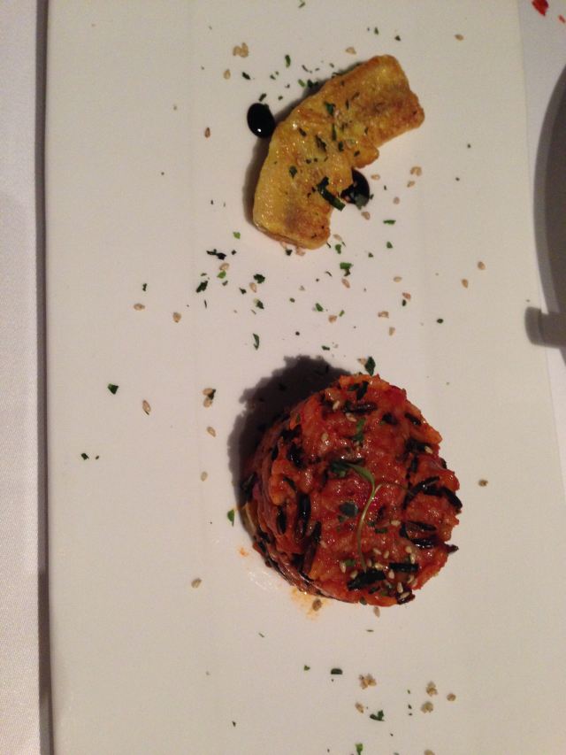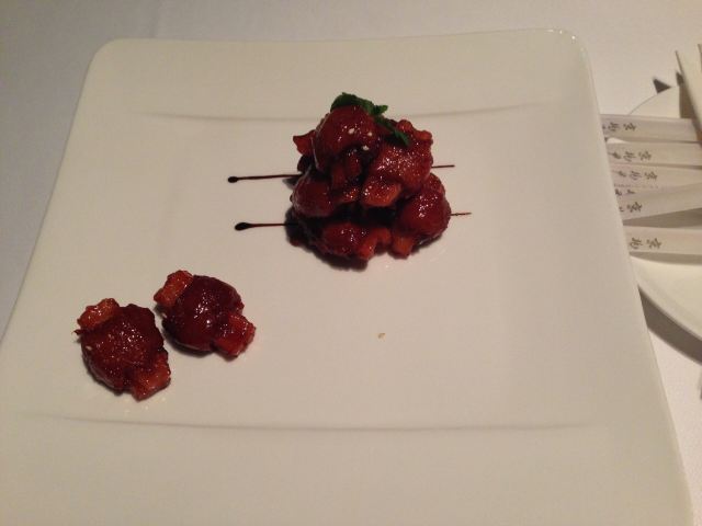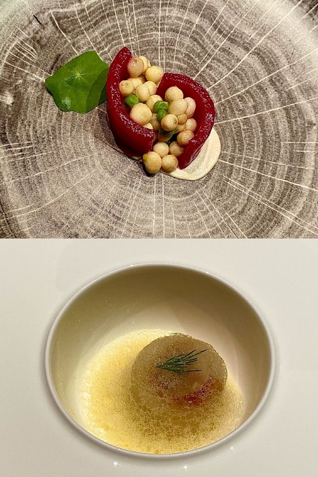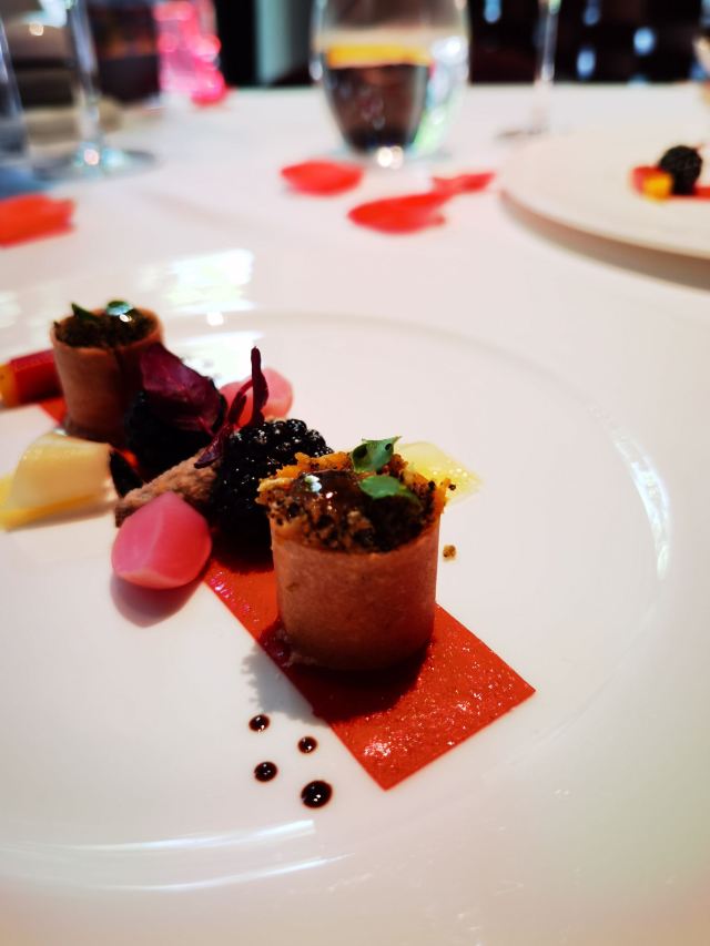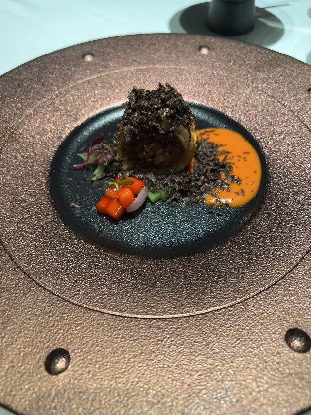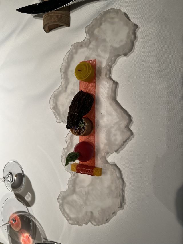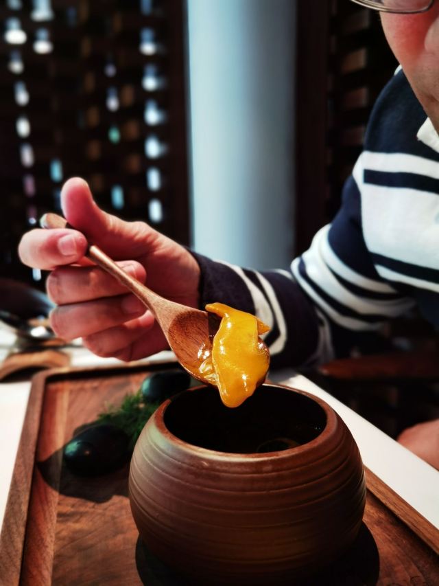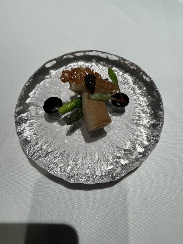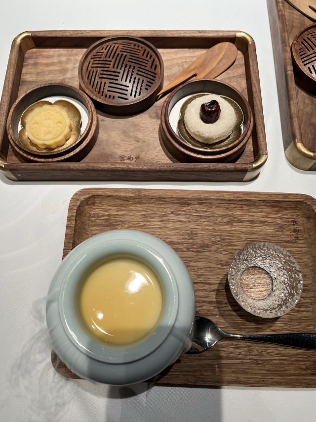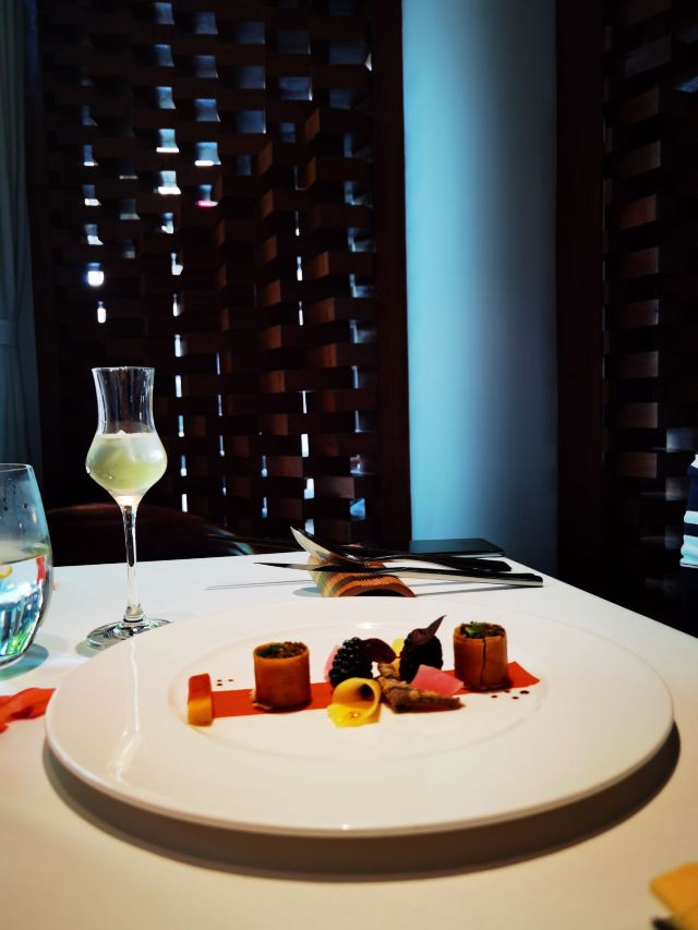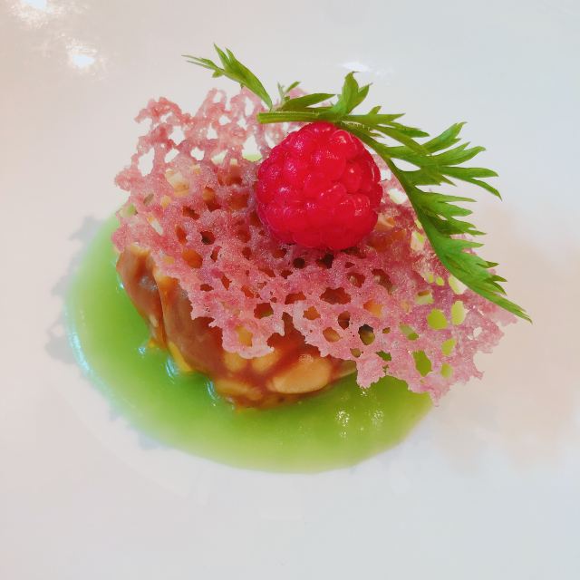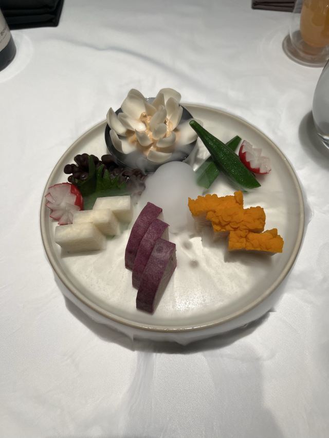 ryan_gao今天吃的菜单是名为《小雪》的节气菜单,包含两道工序开胃小食、一例汤品、六道热菜、一份主食、最后是三种甜品。 缤纷有机鲜蔬与山珍 已经熬好造型的蔬菜山珍们放在荷叶造型的干冰托盘中,端上桌来就会把开餐过程带到一个比较好的气氛,酱料分为芝麻酱、豆酱、玫瑰酱、橄榄油配玫瑰盐,蔬菜蘸上酱料吃除了比较新鲜提神就没有其他印象点了,当然,一盘未经烹饪的蔬菜,能带气氛能提神,他们的使命应完成的很好了。 精致前菜三品 松露茭白入口先感受到黑松露酱的强烈香气,然后是茭白的回甜,作为三品中最清淡的一款小食,做到了清淡而不寡淡。 海葡萄沙拉清爽也比较有层次感,咬第一口直接感受到芥末和牛油果混合味道,继续咀嚼会有玉米的甜味,最后能吃到山药的甜味,比较遗憾是所谓素食鱼子酱的海葡萄在整个过程中没有体现出来,菜品口味的平衡感一般。 红菜头塔塔是小食组中最浓郁的一道,炸物的脆和红菜头的咸在嘴里融合让人愉悦,这时也会非常期待热菜的呈现。 海带芽白萝卜煲鲜鸡枞菌 只加矿泉水及海盐与食材煮4小时,汤品端上来先闻到萝卜的味道,喝起来却是鸡枞菌的鲜味,汤品所有的食材入口即化,即使是萝卜也没有任何的纤维感,冬天喝上一口热乎的素食汤,幸福感满满。 鲜桃仁美人米 用火龙果汁泡过的脆山药环绕在炒鸡头米的外部,酱汁是刚打出来的调味桃仁泥,浓稠的酱和鸡头米还是挺般配的,入口风味十足,配一块粉红色山药,酸酸甜甜清口又解腻。 岩盐牛肝菌冬瓜配昆布汁 蒜香味打头阵的一道菜,打过泡的汤汁为菜品的呈现增加了一丝神秘感,但是味道上不高级,真的很像火锅涮过的冬瓜蘸了一下自己调制的蒜蓉鲜椒蘑菇酱,整体没什么层次感。 醇香鲜笋羊杜菌 三杯手法烹饪出来羊肚菌配上花雕青笋,真的美味绝伦,羊肚菌到嘴里有肉的嚼劲又有一点像豆腐,香味是比较有侵略性的,青笋一起食用过程中会平衡菌的口味,羊肚菌在嘴里快吃完的时候竟然神奇的出现了梅子的味道,仔细的想了一下,原来是花雕酒在从始至终的给菜品完成的串联,最后才出场。 松茸山珍闷瓦罐 酥皮蓬松,瓦罐内奶香四溢,事实上这道菜确实借鉴了意大利菜中酥皮奶油蘑菇汤的做法,只不过这里用了松茸和牛肝菌等高级蘑菇,让菜品香味更显厚重和奢华。