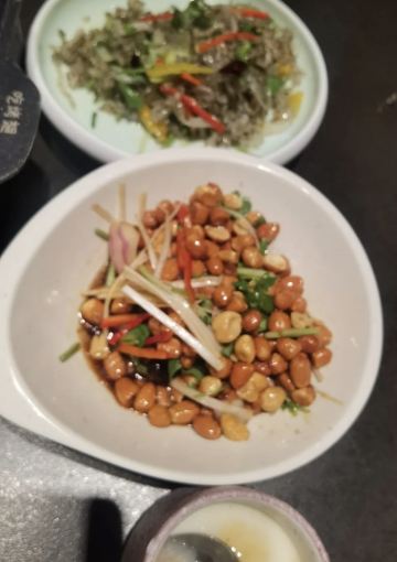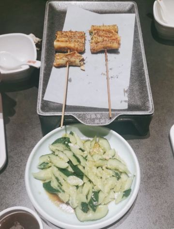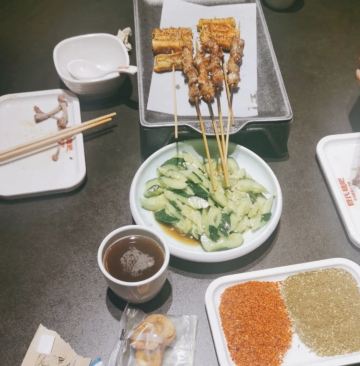 跟同事约饭,选择了单位附近的管氏翅吧,这个管氏翅吧,感觉比台湾街那家更加的有情调,而且人也不多。我们选择了2楼靠窗边的位置,可以说是全店最好位置了。因为人比较多,: 老板还送了我们一盘菜,以及每人一个小布丁。烤串儿非常的好吃外酥里嫩点的都是微辣的,但硝微有一点点辣