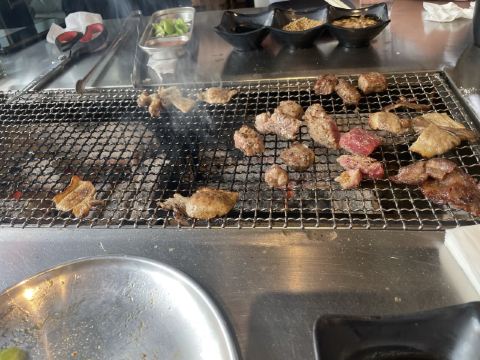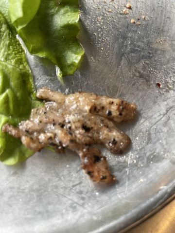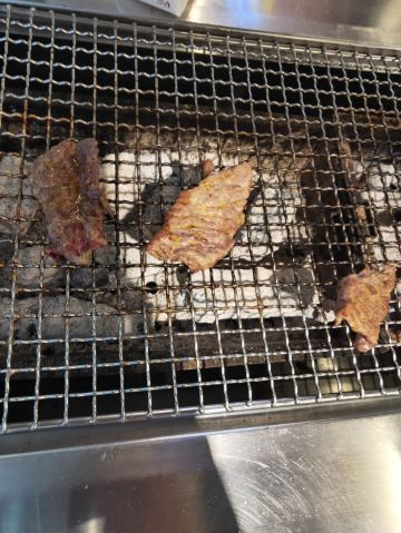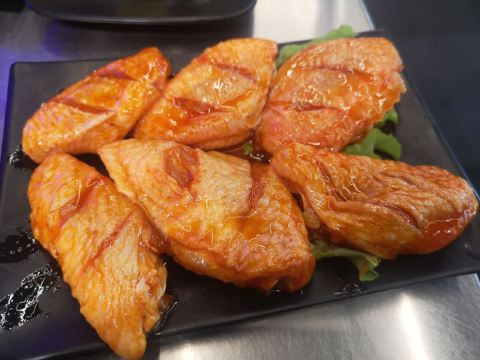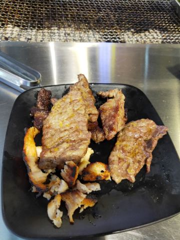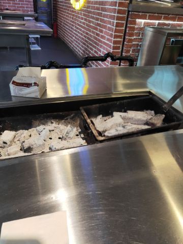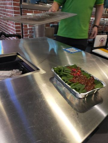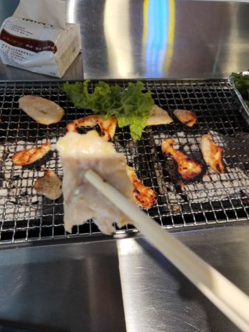 周末中午前来用餐。从12:00左右开始陆续上人,13点左右餐厅基本坐满,消费群体以年轻人为主。 点了烤羊肉串、烤鸡肉串,这两个是烤好了之后上菜的。其他:如鸡翅、扇贝、蜂蛹等需要自己烤。就我个人而言,还是习惯烤好了再上菜,一方面自己烤不仅烟大,而且热的汗流浃背的;另一方面自己烤的时候把握不好火候,技术欠佳,鸡翅都烤糊了。 餐厅提供的牙线还不错,远远好于不少餐厅的牙签。该店总体评价不错。