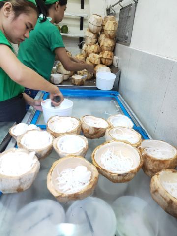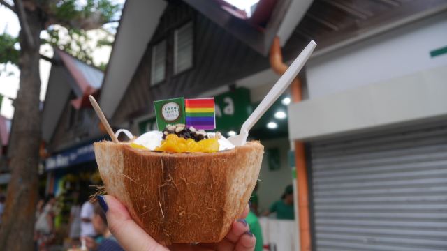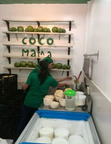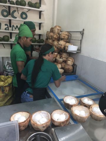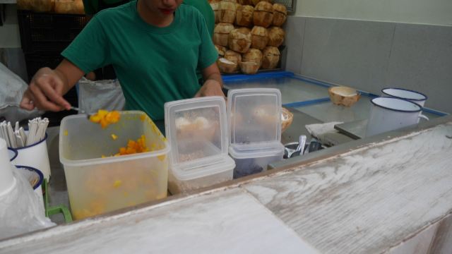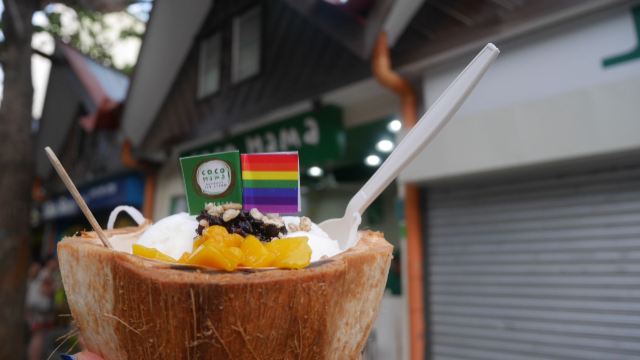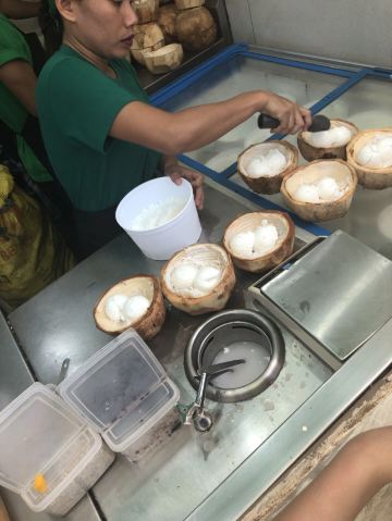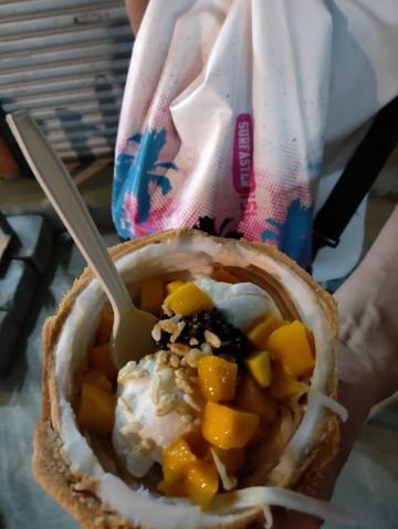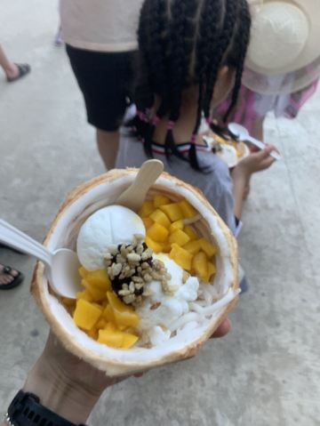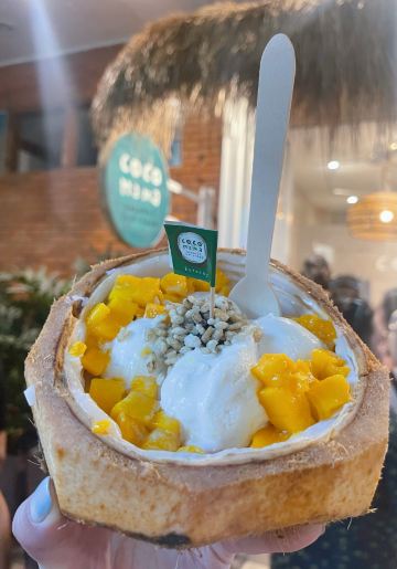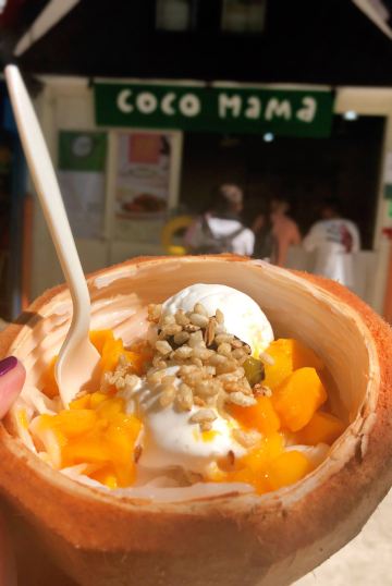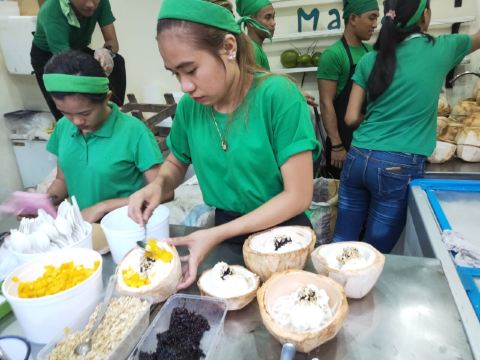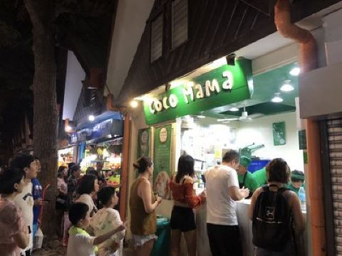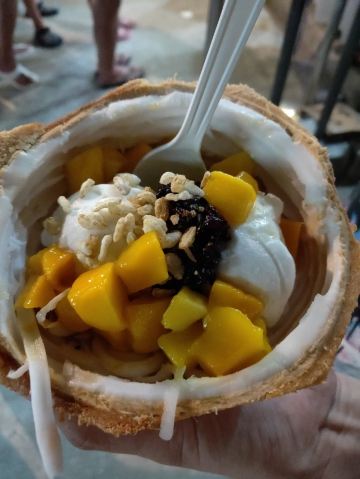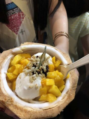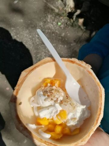 沉默玄风coco mama cocomama就在dmall的小市场内,smoke对面,他家一般开店比较晚,关店比较早啊,所以能吃到很不容易。另外就是经常排长队。 店家服务速度非常快,态度也非常好。 不大的一家店,材料都准备好的,点单后现场拼做。个人觉得很一般,冰淇淋口感普通且偏甜,芒果有酸有甜。 椰子壳垫底,椰肉切成细丝。上面配上芒果和香草冰激凌。由于选用的食材都是当地的,所以保证了新鲜程度,140比索一份不算贵,所以特别受欢迎。