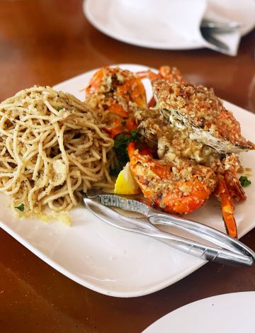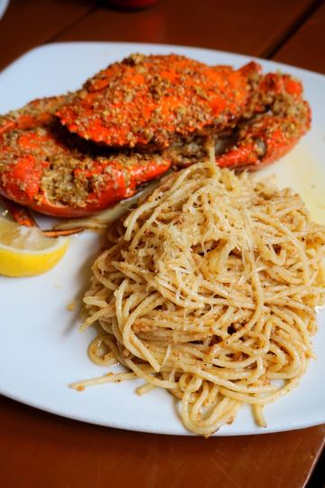 沉默玄风Cyma Greek Taverna 长滩岛的绝对网红店啊 基本要排一个小时才可以吃到啊 拿了号去沙滩溜一圈再回来吃 刚刚好 点了希腊菜中有名的musaka,去之前看了网上很多对这种菜的评价,大多数人都说口味难以接受。不过真的吃到了居然感觉还是可以的,很厚重的芝士味,里面是以茄子和肉末为主,像是吃千层面,分量也蛮大的。 一定要点的是这个螃蟹意面 超大一只螃蟹 意面很入味 他家螃蟹面如果单看价格,一点都不便宜,折合人民币100多,但非常合适,一个螃蟹️就大到能把你干饱,面里应该是加了蒜蓉,特别好吃