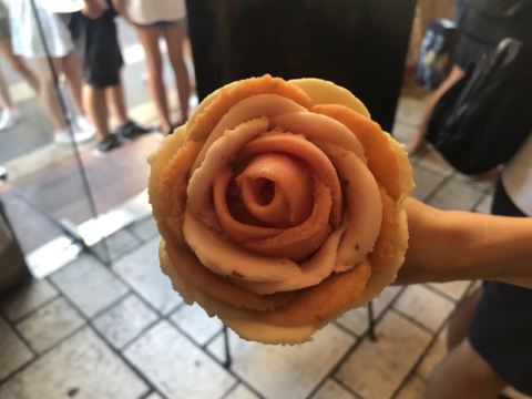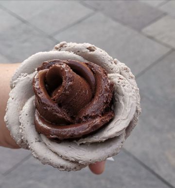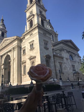 这家Gelarto Rosa是个冰淇淋店,位于布达佩斯的市中心,圣伊什特万圣殿的西南侧。这家店的特点是冰淇淋颜值很高,通过各种口味冰淇淋做成玫瑰花瓣的形状,粘合成一朵冰淇淋玫瑰。由于造型别致,大量游客排队购买,味道并没有太多出众的地方。