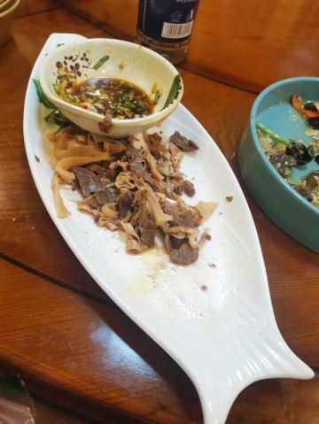 bluecrane【位置】从金水鹤酒店打车过去8块钱。周边蛮多好吃的。 【服务】老板和收银台旁卖鱼干的姐姐态度都很好,老板最后还亲自开车+叫了朋友开车,把我们送回酒店,没收车费。 【环境】一楼是大堂,二楼有包厢,包厢可以坐十一二个人一桌,就是空调没有提前开,有点冷。 【菜品】都好吃!!! -土豆饺:就是黑色的饺子,第一次吃,爱了爱了!这皮有一股特别的韧劲儿,咬起来口感很舒服。 -凉面:冬天也要带冰碴子才好吃!特别是啃了辣鸡爪,来一口凉面压一压,太爽了! -米酒:才1度,当饮料喝。 不过我还是喜欢蓝莓汁。 -小黄牛肉蘸酱:虽然是招牌,却没什么印象。 -鱼干:这个是一楼店内小摊上的,不在点菜里,到也好吃!