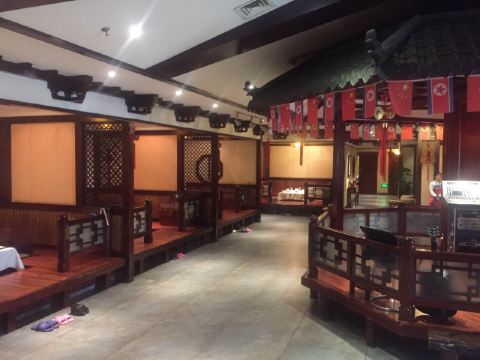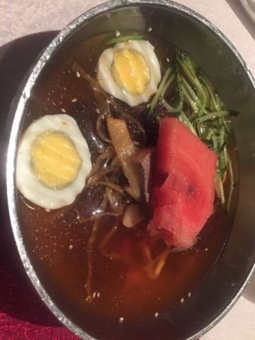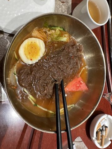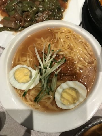 非常有特色的美食,朝鲜冷面、朝鲜冷狗肉等。环境像到了朝鲜一般。服务员全部来自朝鲜,很特别。