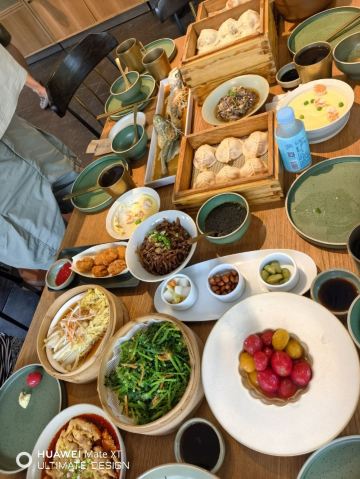 泰汁海鲜沙律,海鱼豆腐汤,小米海鲜粥,蒸豆豉黄花鱼,黄瓜鸡蛋蒸饺,冰镇荔枝小番茄,老幺口水鸡,蒸饺全家福,手剥大虾蒸饺,臻品海胆蒸饺