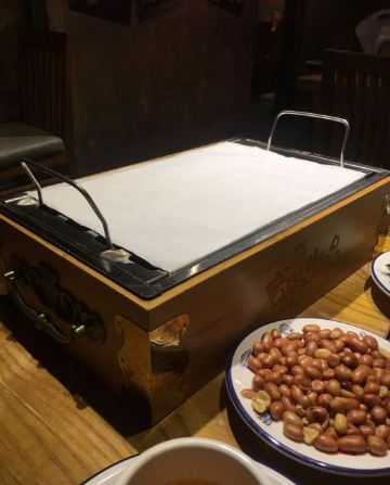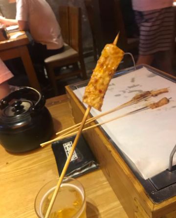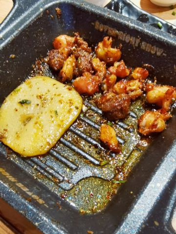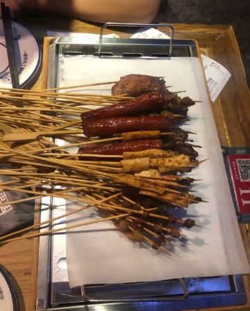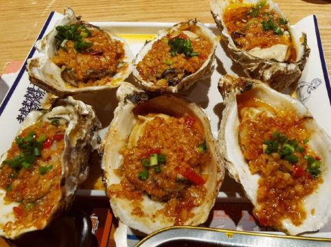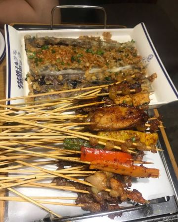 离家很近,经常来吃,这次发现楼下的装饰换了一下,加了座椅可以方便等位,服务更人性化了。 这次的套餐有拍黄瓜,拌粉,我们自己又加了牛筋,千叶豆腐,韭菜鸡蛋这些经典喜欢的菜品。味道一如既往的好吃,不多说。 重点是新加的几个菜品,还是很有创新性的。 茉莉茶冻,这是送的,清凉解腻,正好在吃完烧烤后吃。 主推的超级大串,有三种口味,虽然肉块比较大,但烤得火候很好,外焦里嫩,可以兼顾不同爱好的人。 芝士生蚝,这个味道看个人喜欢了,有芝士,还有芥末,跟平时吃的烤生蚝完全不同。 每次到这里吃饭,都不会失望,强烈推荐!