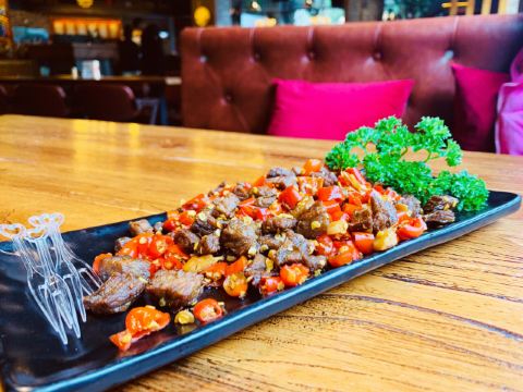 澳洲T骨牛排,泰椒牛肉粒,芝士玉米薄饼,芥末黄瓜,水果沙拉,薯条,老卤水大拼盘,鸡尾酒,德式小麦生啤,和牛肉酱意面