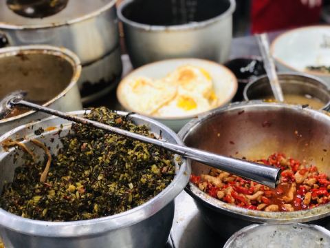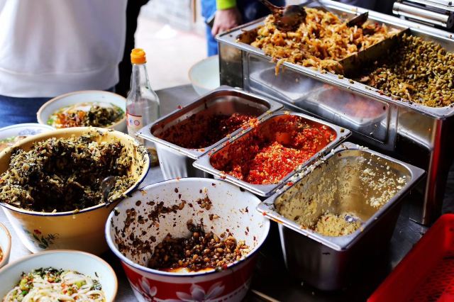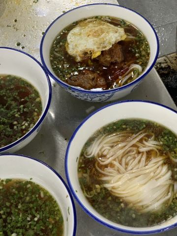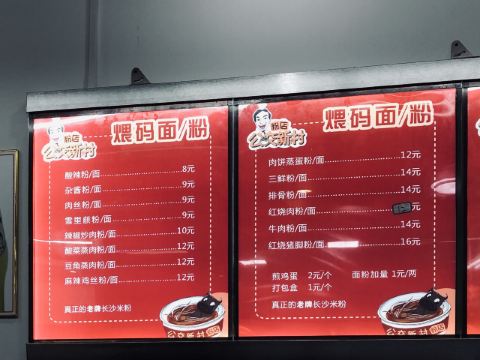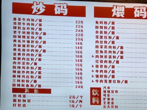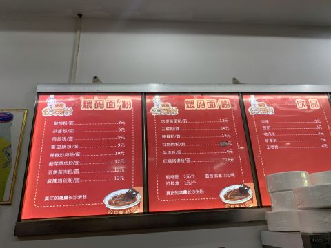 牛肉雪里蕻粉,排骨粉,肉丝雪里蕻汤粉,肉饼蒸蛋粉,红烧牛肉面,麻辣鸡丝粉,米粉,红烧肉粉,干豆角蒸肉,生煎包,公交新村粉,炸酱雪里蕻,榨菜,雪菜粉,肉丝面,炸鱼皮,太阳蛋,牛腩捞面,鲜牛肉拼猪杂汤粉,招牌牛肉雪菜河粉