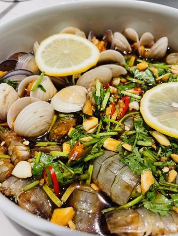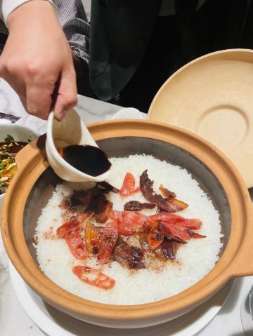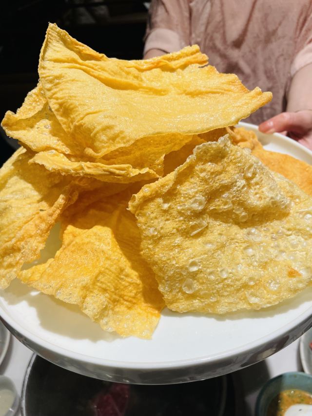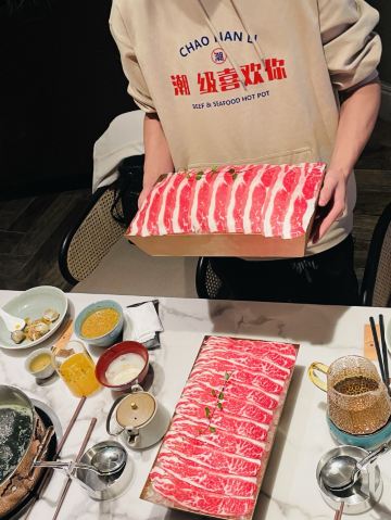 金海华集团的起源地,常熟旗下潮南里潮州火锅,生腌绝佳。对于食材的选择,启用高标准。一定要试一下南澳紫菜瑶柱虾皮锅底,鲜味绵长萦绕,搭配肉类最佳。 牛肉品质也很好,手打墨鱼丸加入了雪花牛肉粒。 刺身拼盘,三文鱼大腩搭配法国吉拉多生蚝,再喝一口紫菜汤,口感更上一层楼。腊味煲仔饭锅巴的火候绝妙,脆口而不粘牙,水分比例掌握很好。 以酸奶冻结束,虽然吃到撑,但是绝无负担,一点沉重感也没有,值得推荐。 金海华出品,果然不负所望!