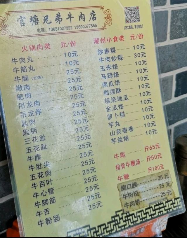 横竖是二温小迪🌈官塘兄弟牛肉店可以说是潮州最红的牛肉火锅了,主打的是现杀的鲜牛肉,不仅牛肉新鲜,价格还非常美丽。 🚗餐厅的位置还是有点偏的,我们住在潮州古城里,从广济门打车到餐厅,去的时候42,回来51,我们吃一顿牛肉才151元。 ✅我们是元旦中午去吃的,12点50到了,等了15分钟就坐到座位。 🌿环境:餐厅有上下两层,一楼都是小间间小隔间,走的是古风。 「清汤锅底」锅底真的好便宜,只要10元。 「牛筋丸」牛筋丸一份6个15元,和牛肉丸价格一样。本来想让店员给我们搞三个牛肉丸,三个牛筋丸的,店员说不可以。牛筋丸还是很好吃,q弹q弹的不说,味道也好吃,我潮州大概吃了6家牛筋丸,他们家可以排第二。 「雪花牛肉」点了雪花,嫩牛肉,吊龙,最爱雪花,略带甜味,很嫩,有点油脂,非常好吃,吃了半盘也没觉得腻。 「嫩肉」肉质和口感都不如雪花,稍微柴了一点,有的部位咬上去筋筋拉拉的。 「吊龙」吊龙也好吃,也很嫩。 「胸口朥」这个东西不知道怎么煮,我广东的朋友推荐的,开始煮了2分钟就吃了,感觉好油,后面多煮了一会儿也没觉得多好吃。总感觉打开方式不对! 👩🏻🍳服务真的很一般,第一次来,一脸懵逼,都不用点锅底,清汤锅就端上来了.上菜时,肉是一起端上来的,也不告诉你,这是那个部位的。由于一开始桌上放了一碗沙茶酱,我以为只有一种调料可以吃,后面看到其他客人端着着调料过来才知道原来还是有调料区的。 🌸总体来说,味道和性价比都是好的,牛肉均一价都是29一盘,我们两个人4盘牛肉一盘牛筋丸,加饮料锅底什么的,一共吃了151.