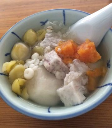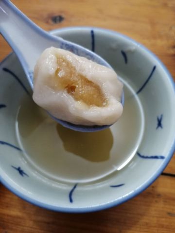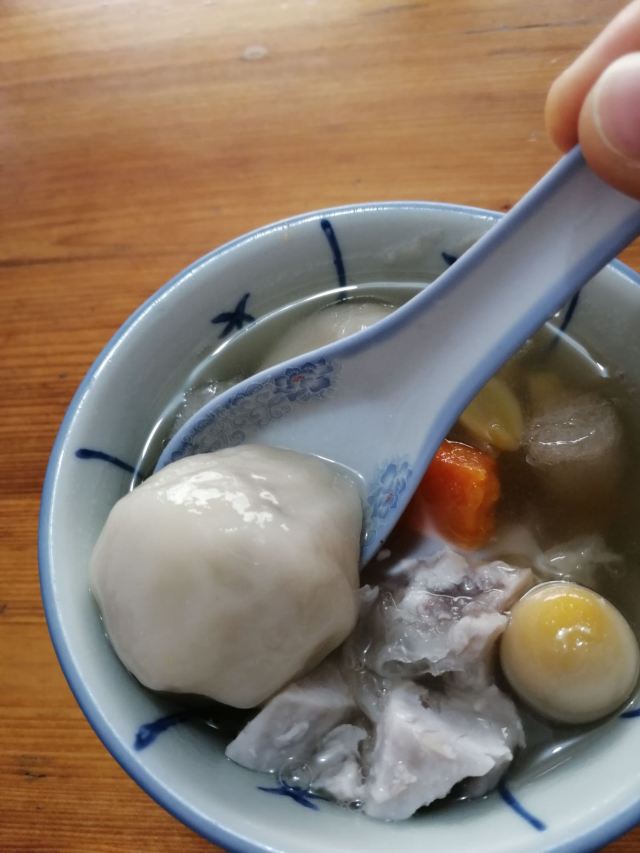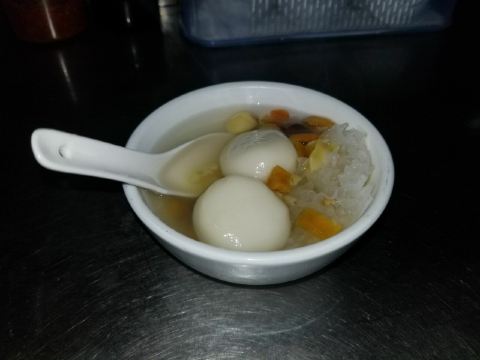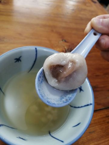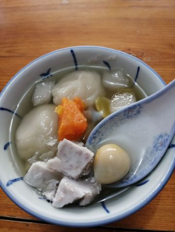 【位置】 太平路上,很大的招牌。很好找 【鸭母捻】8元 曾经上过央视纪录片的胡荣泉,必须来打卡。之前看评论有说这里不是很好,不过我的感觉还是很不错的。 这是一碗配料特别丰富的糖水,比如鹌鹑蛋,番薯,芡实,白果,香芋汤圆,绿豆沙汤圆……之前看评论说这家比较甜腻,我自己的感觉是甜的确甜,但是是可以接受的那种。中式甜品嘛。 印象深刻的就是这两颗大汤圆了。形状上也和常见的不一样,收口是能看得到的,有点像包子。馅料太舒服了,香芋和绿豆沙,必须香啊。