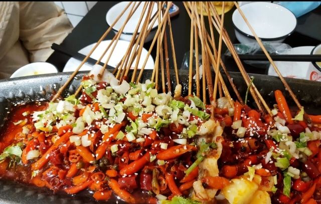 摩小亚魁星楼街排队霸主前三甲,必须有这家【成都吃客】。 不管什么时候,工作日还是周末,中午还是晚上,随时都在排队中,反正我每次经过是这么一番景象。 所以有时是想去,但是害怕去,特别是在炎热的暑假旅游旺季。 前两天,家里的亲戚从南京过来,想了很久,考虑到基本上不吃辣椒,还要在市区,最好离景点近一点, 那么这家真的就是第一首选了,所以我去了,早早的就去了。 生意火爆异常,吃之前排队很疯狂,吃完了出来,天都快黑了,还有很多很多人在等位,真是替大家觉得心酸难过哦。 【特色烤鱼片】88元 这么多年一直都是榜上有名的招牌菜,鱼片鲜嫩无刺,酱汁带着藿香和泡椒滋味,不会很辣,但是很开胃,吃完鱼片想用哪个锅底的汁拌白米饭吃呢。 这个鱼片还配了一钵酸菜豆腐鱼汤,这个受到大家一致好评,汤色呈浅浅的奶白色,微酸爽口,一口气可以喝好几碗。 【裸奔坨坨虾】49元 扒了虾壳去了虾线的净虾肉哦,真的是好贴心,还更入味。 油泼干辣椒的香气,上桌就直勾勾的诱人到不行。 【纸上焗鲜鲍】69元 这个鲍鱼个头还多饱满的,重点是垫底的方便面很好吃哦,很吸味,软硬也刚刚好; 【相思红颜】冰凉的糖水小番茄,特别适合用来餐前或者餐后,也是解辣神器哦。 【红糖豆花】嫩嫩的豆花里有红豆颗颗,淡淡甜香,不腻,很可口; 【碳烤猪鼻筋】3元一串。鼻筋的口感是真的很妙,算是我现在的新宠,吃过才知道哦; 【蒜香排骨】也是一道不怎么辣的菜,蒜香还多足的,排骨的肉也挺厚实,值得尝尝。 不吃辣椒,在四川还是多局限的,少了品尝很多特色美味的机会哟。