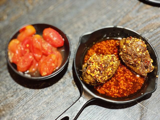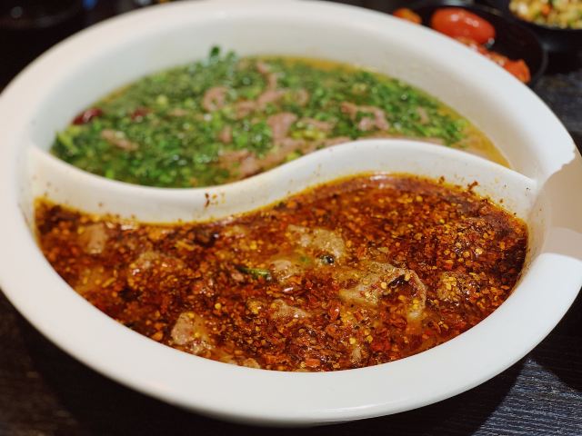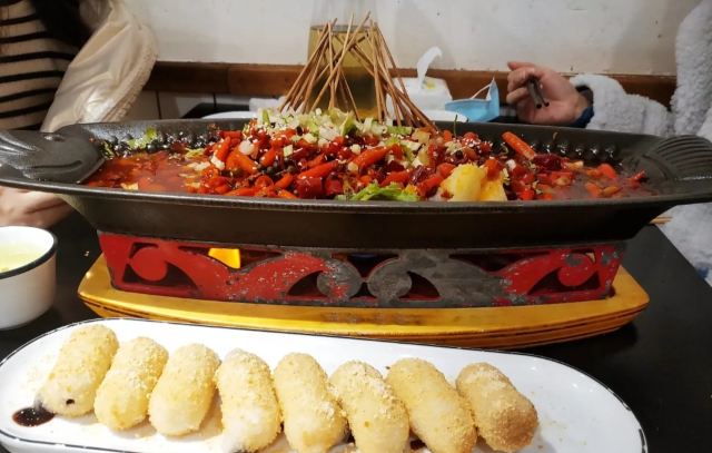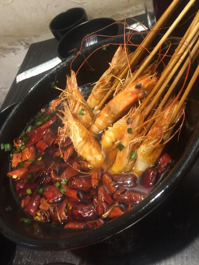CHENG DU CHI KE吃,是每回我到成都的主题。我喜欢成都的美食,是我喜欢的香、麻、辣,偏温和点,又不似重庆那般辣得胃疼。川菜、火锅是每回来成都必不可少的美食。 成都吃客是我回头率较高的一家新派川菜馆子。早上10点多下飞机,午饭就想吃这家成都吃客。成都当地的朋友也经常来排队的一家馆子。每一次来都有惊喜,能让人看到一些传统菜式上面的创新,新式吃法让人觉得非常的有意思。 裸奔坨坨虾,热油泼生虾,噼里啪啦作响,3分钟即熟。每只虾的个头大小均一,虾肉新鲜紧实,虾壳都提前剥好了,吃的时候非常的方便~ 鸳鸯水煮牛肉,大概是水煮牛肉与鸳鸯火锅的一个结合,非常的有意思。一大盆端上桌,一壶热油现场倒入,牛肉与热油的滋滋作响,香味扑鼻而来,更是让人食指大动!分量非常的足,牛肉嫩滑而易嚼,里面还配有青菜,每一片牛肉与青菜都极为入味。辣与不辣,都好吃~ 蘸水鸭肠异常的脆口,鸭肠的这种吃法倒也是第一次见~蘸水的辣度也调得很宜人,鸭肠放入蘸水滚一圈,均匀带上辣汁,口味很赞~ 今年成都的馆子好像特别流行这个蜜汁番茄,是解辣神器。 糖油果子,路边有吃过,用竹签5个串一串。在这里以树状出现,倒也有些意思。炸得不错,个个浑滑光亮,里头是空心的,吃起来外酥里糯,有点甜~ 饭点排队人多,注意提早去哈 营业时间: 人均80