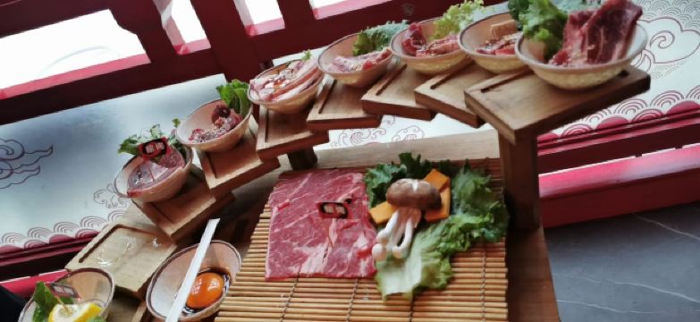 烤肉,全牛大满足盛宴,厚切猪五花,爆汁牛骰子,秘酱厚切牛五花,西葫芦,牛肉丼饭,雪花松板肉,山形县烤年糕,鱼籽海苔芝士炒饭