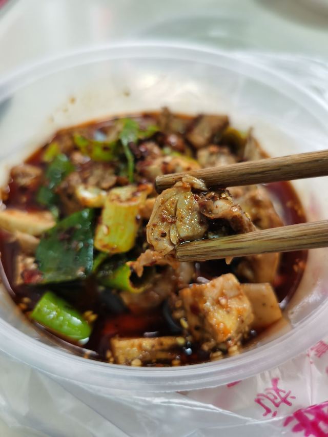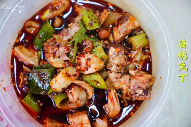 一个婆婆,两个媳妇,合力开店。也是新都的一家老店。吃了很多家,准备来打包一个小小份,去下一家吃。我说买15元的兔丁,被老板鄙视了。买了20元老板才开始拌。 兔丁大块,里面加了醋还是与众不同,不过我吃起来有点怪了。可以叫怪味兔丁。 如果不是路过,我觉得可以不用打卡了。