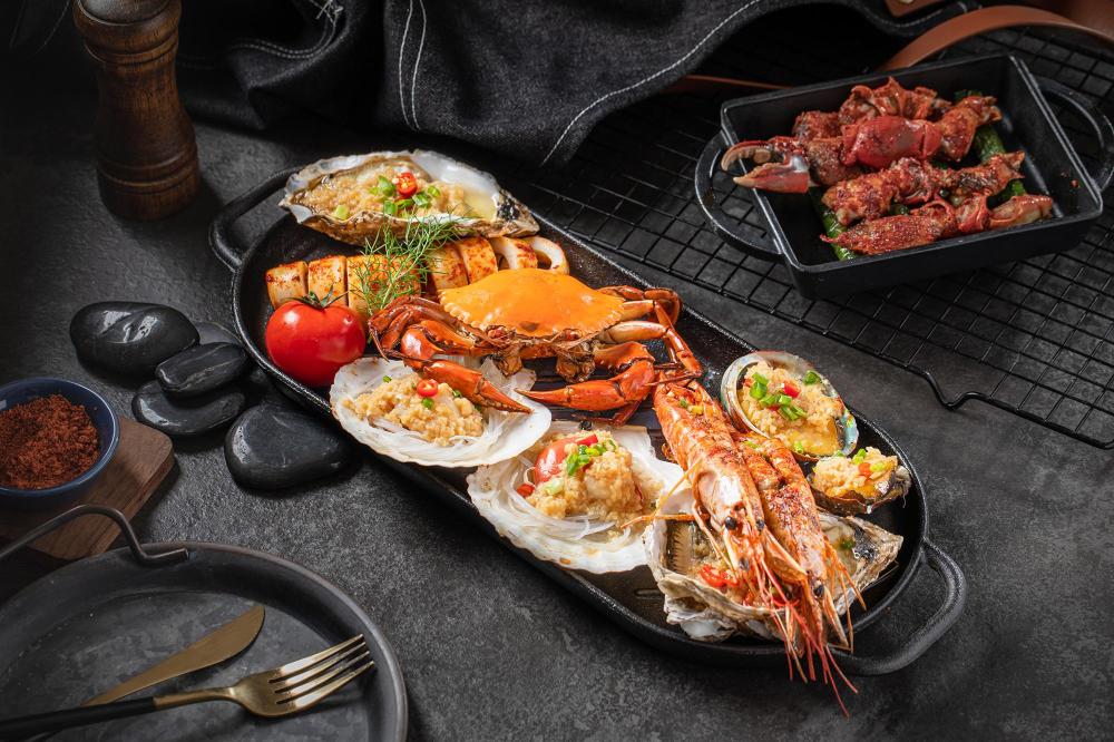 脆皮猪肘,澳洲M5级特选西冷,西班牙油蒜大虾,风味洪湖莲藕,手指蔬菜棒,香煎云南纽扣蘑菇