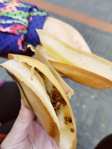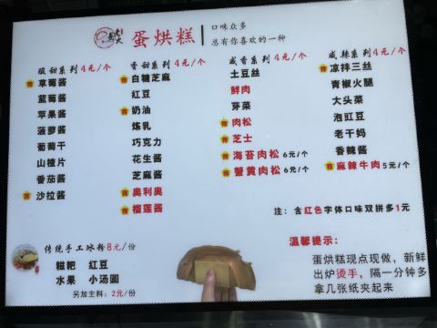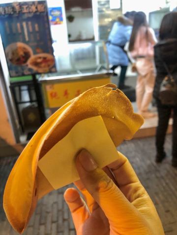 YI LAO DA DAN HONG GAO特地到奎星楼街来觅食,很多地道小吃,边吃边逛特开心! 蛋烘糕也是成都名小吃,现做的蛋烘糕里面可以夹各种夹心,甜的咸的辣的口味选择多多,还可以双拼哦! 点了芝士和麻辣牛肉的,热乎乎的拿到手可真香,好吃不贵边错过!