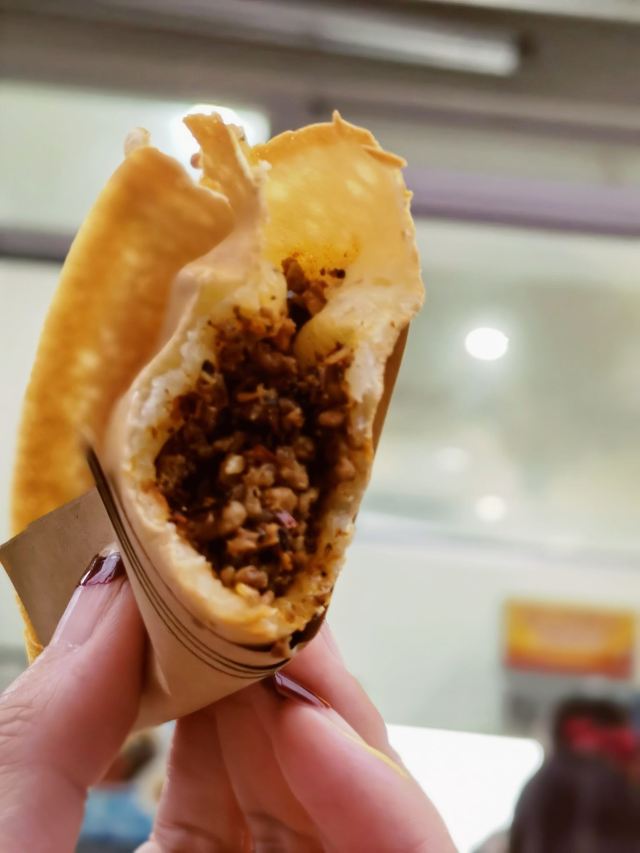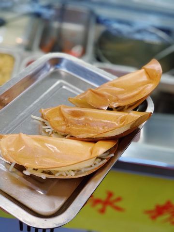摩小亚现在魁星楼街也算是接待外地游客的一个好去处,离宽窄巷子近,关键是这条街上的食物比景区的肯定要好吃一些,性价比也更高。 逛完了来这边吃饭才是正确的打开方式,况且现在这附近的美食品种还挺丰富的。 带外地朋友,在旁边吃了【成都吃客】、【禅泉冰粉】,然后经过这家蛋烘糕,就试试呗。 蛋烘糕每次我都很纠结,因为口味太多,还可以混搭,所以真的是很难选啊。 【土豆丝+豇豆】蛋烘糕 我的天,好油好油!油得可以一边吃一边往外滴油水水,好尴尬,好失望。 蛋烘糕个头比较大,比贺记的要大很多,馅一般,不算饱满。 味道很淡,油很重,不好吃。 恩。一次失败的尝试。