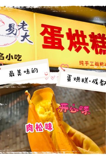 筱风姿成都名小吃|特好吃的蛋烘糕—易老大 来了成都一定要吃的名小吃 来了成都一定要逛的小吃街 这里就是魁星楼街的易老大蛋烘糕 真的特别好吃的蛋烘糕 口味选择超级多 自然人也是极多的,需要排队等候 推荐:肉松味的(¥3.00) 面皮有点酥脆、有很松软,肉松嚼起来很香 特别推荐这个口味的,尤其是喜欢肉松的你 甜味的、咸味的,基本上都是¥3.00 还有几个是¥4.00(奥利奥、芝士、榴莲、麻辣牛肉) ———————————— 店铺:易老大蛋烘糕(奎星楼总店) 地址:奎星楼街18号附11号(名堂创意工作室纽咖啡正对面,大银杏树下面) 交通:地铁4号线宽窄巷子B口 ⏰营业时间:11:00-21:30 人均:¥3.00
