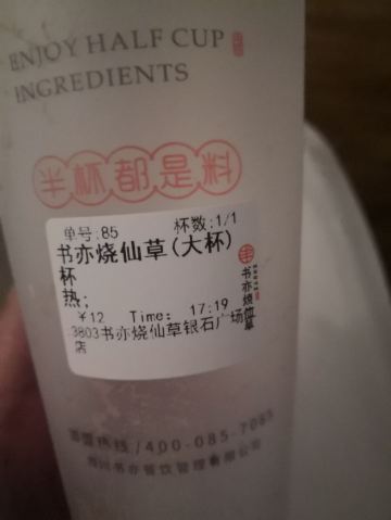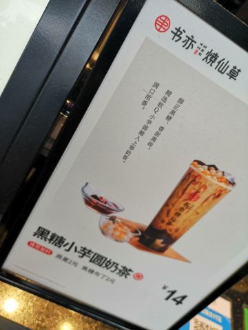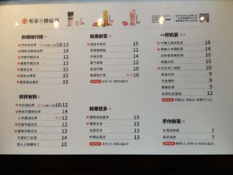 书亦烧仙草,杨枝甘露,书亦烧仙草(大杯),葡萄芋圆冻冻,葡萄优多,葡萄柚益菌多,小芋圆烧仙草,葡萄酸奶冰,黄金珍奶,牛魔王蛋糕奶茶,爱玉,芝士蜜桃乌龙,鲜橙葡萄柚,芝士抹茶,椰果,百香青柠QQ绿,黑砖,台湾四季春茶,烧仙草
