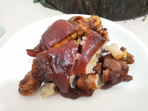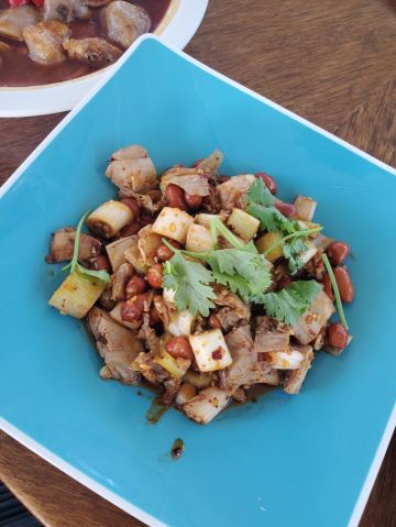 森湖山庄的三道菜,五彩鸡(青红辣椒加子姜爆炒)、豆腐鱼、盐水鸭,配餐无须点菜,老朋友请客也不知道贵不贵,骑车骑了一天有点疲惫三个人六瓶啤酒,我半瓶有点吃亏。