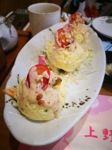 芝士烤虾,鳗鱼饭,三文鱼火炙寿司,鹅肝寿司,上野招牌卷,芝士烤红虾,樱花卷,三文鱼刺身,章鱼小丸子,柴鱼片芝士焗土豆泥,美味鳗鱼饭,土豆泥沙拉,富士山下卷
