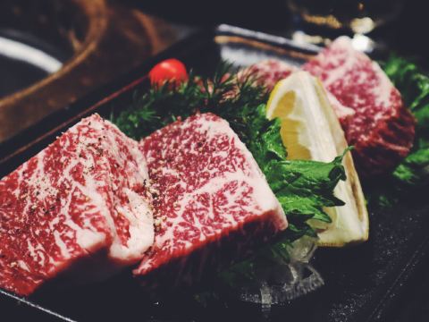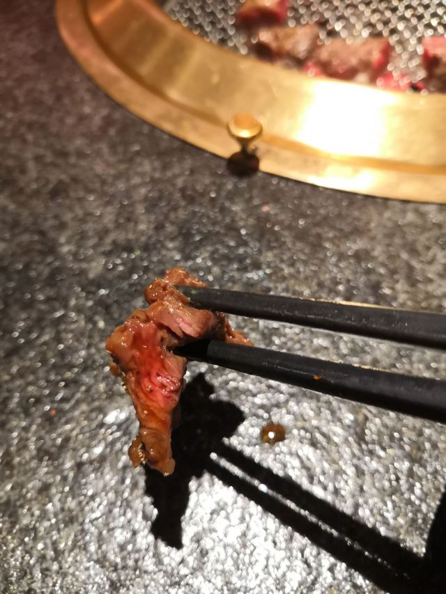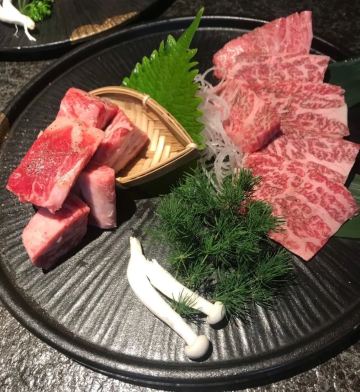 第二次来这家感觉还是很棒,598的双人套餐内容相当丰富。 其中有一个牛肉拼盘,包括了【薄切牛舌】【M9+板腱薄切】【M9横膈膜】【M9肋条】【M6胸五花】每样一点,都可以尝尝。烤肉的小哥哥很认真的烤,我们很认真的吃。每烤一种肉就换一个烤盘,真的是烤得精致。这么些肉里面,除了觉得牛舌稍微烤老了一点儿,其他口感都很不错,特别是那个方块形状的很赶口。 【伊比利亚霜降松板肉】唯一的猪肉,口感很Q弹,蘸海椒面吃起安逸。羊小排没有了换成了【牛胸肉】也是很嫩气的。【泰国野生黑虎虾】个大又新鲜。去了虾线,肉质鲜美,只撒点海盐就很好吃了。 特别喜欢那个【喜烧纯血和牛手握】,切得很薄的和牛肉。上桌之后用喷枪烤制,没多久就熟了,生熟程度刚刚好,还透着一点儿血色。包裹寿司米吃起来相当软嫩。 【土豆沙拉】也很棒,口感非常细腻。样子也好看,摆盘精致。 虽然这个套餐都已经吃得很饱了,但是之前看前辈推荐了他家的【和牛炒饭】忍不住点了一份,38元。够分两小碗,太香了,米饭粒粒分明,油润饱满,不知不觉就刨完一整碗。 最后还送了小杯酸奶,安逸~服务真的超好,把我们送出门过后,还给我们指路地铁站的位置,哈哈。